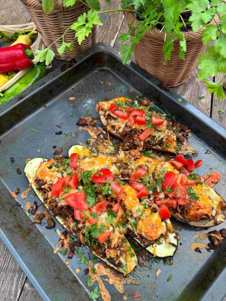 Ugnsbakade auberginehalvor fyllda med en smakrik köttfärsröra och toppade med ost och färska örter.