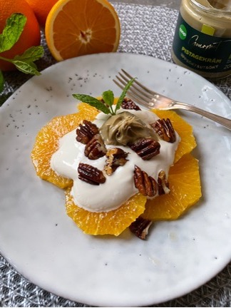 En enkel dessert med en fantastisk kombination av apelsin och pistagekräm!