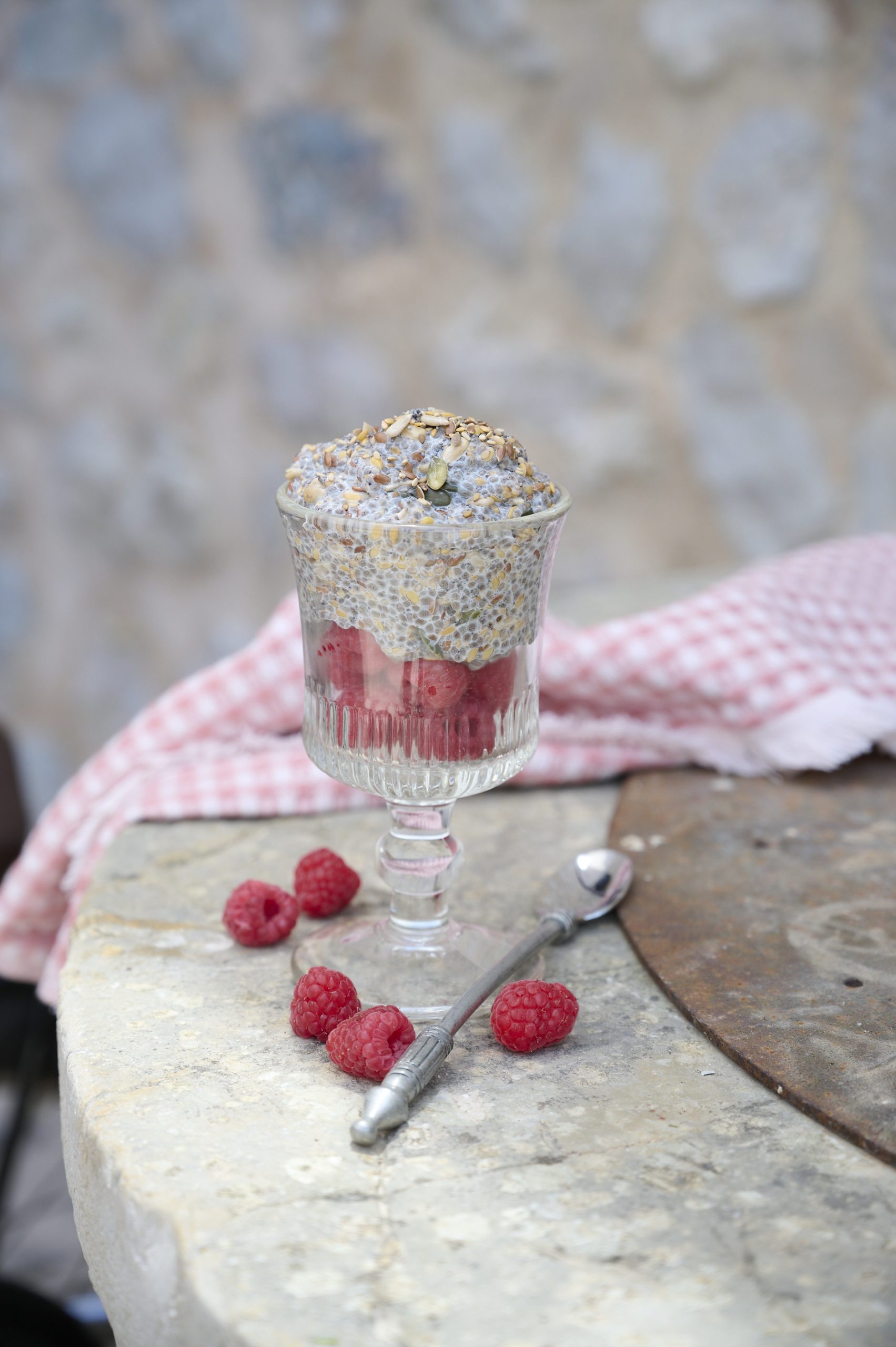 - Lägg hallon i en skål och lägg på chiafrögröten.