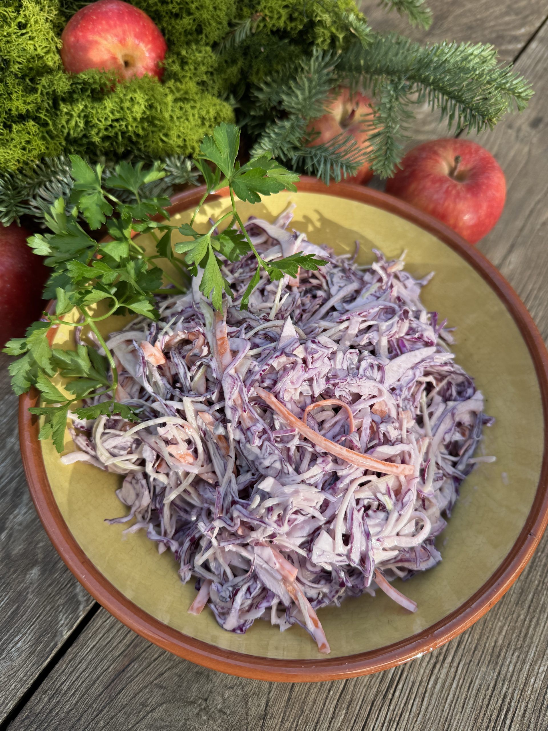 - Blanda ihop gräddfil, majonnäs, senap, salt och peppar i en skål.