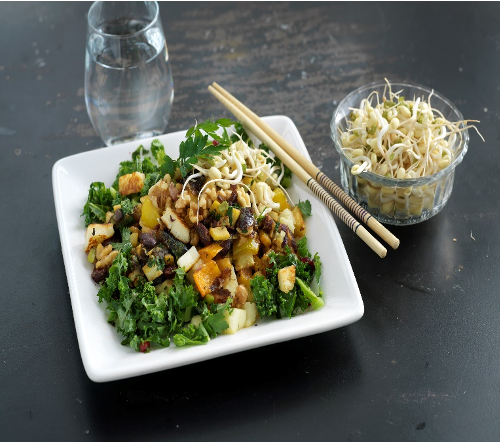 - Lägg halloumin över vegopytten och servera med grönkålssallad och böngroddar.
